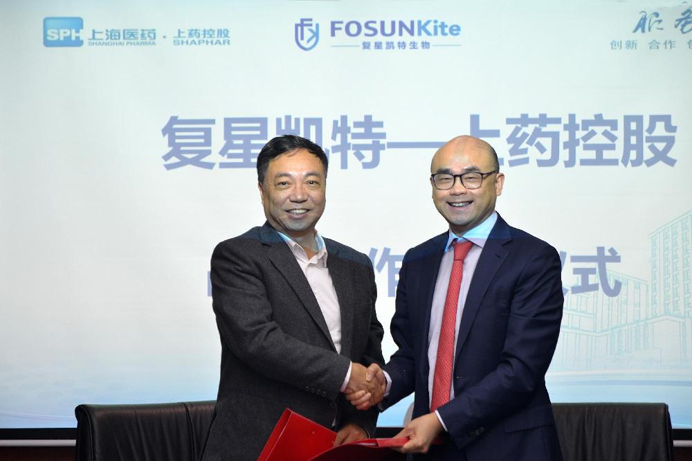 ▲復(fù)星凱特總裁王立群(左)同上藥控股總經(jīng)理李永忠(右)簽署合作協(xié)議